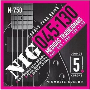SÉRIE CORDAS DE BAIXO Especificações: Instrumento: Contrabaixo 5 cordas N-750 MEDIDAS: 045″/.130″ CONTRABAIXO ENCAPADAS COM NÍQUEL ALMA HEXAGONAL ESCALA LONGA CONTÉM 5 CORDAS prata SOL(G) .045″ (1,14mm) roxa RÉ(D) .065″ (1,65mm) verde LÁ(A) .080″ (2,03mm) preta MI(E) .100″ (2,54mm) preta SI(B) .130″ (3,30mm)